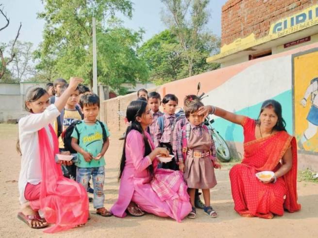 गुरुकुल में बच्चों को तिलक लगा व पुष्पवर्षा कर किया गया स्वागत