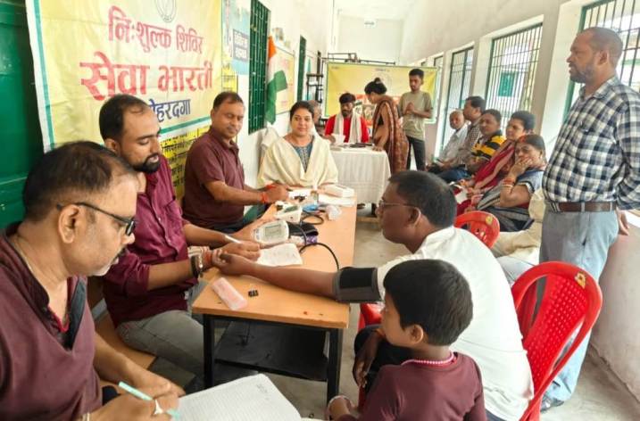 लोहरदगा। सेवा भारती लोहरदगा के द्वारा चुन्नीलाल उच्च विद्यालय प्रांगण में लगातार 173वें सप्ताह 5 अक्टूबर 2025 को निःशुल्क स्वास्थ्य जांच एवं चिकित्सा शिविर का आयोजन किया गया। जिसका जिला अध्यक्ष दीपक सर्राफ, डॉ कुमुद अग्रवाल, उपाध्यक्ष अवधेश मित्तल, सहसचिव संजय चौधरी और अनामिका भारती ने संयुक्त रूप से भारत माता के तस्वीर के समक्ष दीप प्रज्वलित कर एवं पुष्प चढ़ाकर शुभारंभ किया और भारत माता की जयकारा लगाते हुए नमन भी किया। निःशुल्क स्वास्थ्य शिविर में 40 लोग स्वास्थ्य संबंधित जांच करवा कर लाभान्वित हुए। शिविर में हीमोग्लोबिन, यूरिक एसिड, ब्लड ग्रुप, शुगर, बी.पी, वजन, हार्ट बीट, ऑक्सीजन लेवल आदि का निःशुल्क जांच किया गया एवं अन्य सभी प्रकार की स्वास्थ जांच पैथोलॉजी के माध्यम से आधे ख़र्च में ही करायी जाती है। जिला अध्यक्ष दीपक सर्राफ ने कहा हम सभी को अपना कर्म निःस्वार्थ भाव से करते रहना चाहिए, स्वस्थ शरीर रहने पर ही जीवन का सही सुख है, अपना शरीर ठीक रहेगा तब ही आप और आपके परिवार खुशहाल रह सकते है। डॉ. कुमुद अग्रवाल ने कहा की घर पर कहीं पर से किसी भी तरह का दुर्गंध आने पर तुरंत उसे खोज कर ठीक करते हैं उसी प्रकार शरीर में किसी भी तरह का बीमारी होने पर उनका चेकअप करा के उक्त बीमारी का इलाज कराना चाहिए। उपाध्यक्ष अवधेश मित्तल, सहसचिव संजय चौधरी एवं अनामिका भारती ने कहा की प्रत्येक सप्ताह इस स्वास्थ्य शिविर में लोग अपना स्वास्थ चेकअप करवा कर अपने उक्त बीमारियों का यहाँ डॉक्टर से इलाज करवाते हुए उनकी सलाह से स्वस्थ हो रहे हैं। शिविर निरंतर प्रत्येक रविवार को सुबह एक घंटे के लिए लगाई जाती हैं। शिविर में अंजलि सर्राफ, लक्ष्मी नारायण भगत, शारदा देवी, अतुल सर्राफ, सच्चिदानंद अग्रवाल, सुनीता वर्मा, सुनमना देवी, मणिलाल प्रसाद, गौरी शंकर चौधरी, हंसराज कुमार, रमेश महतो, नवनीत गौड़, किशोर अग्रवाल, सोनी देवी, दीपक श्रीवास्तव, देवनारायण प्रसाद, रामप्रसाद कसेरा, उषा देवी, अरिवल कुमार, शंभू सिंह, तुलसी उरांव, तपेश्वर अग्रवाल, रामकुमार महतो, राजेश अग्रवाल, रमेश शर्मा आस्था कुमारी, लाल मुनी देवी, साणीउल्लाह अंसारी, सूरज कुमार साहू आदि उपस्थित थे।