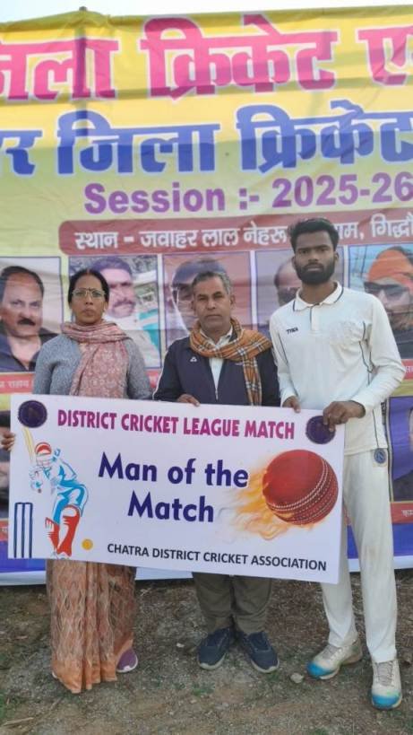 गिद्धौर (चतरा)। चतरा जिला क्रिकेट एसोसिएशन के तत्वावधान में 7 दिसंबर 2025 को गिद्धौर प्रखंड मुख्यालय स्थित जवाहरलाल नेहरू स्टेडियम में बीसीएसी बनाम पिपरवार के बीच रोमांचक क्रिकेट मुकाबला खेला गया। टॉस जीतकर पहले बल्लेबाजी करते हुए बीसीएसी की टीम ने 28 ओवर में सभी विकेट खोकर 163 रन का सम्मानजनक स्कोर खड़ा किया। बीसीएसी की ओर से सचिन ने शानदार बल्लेबाजी करते हुए 36 गेंदों में 46 रन बनाए और टीम की पारी को मजबूत आधार दिया। पिपरवार की ओर से गेंदबाजी में रवि ने बेहतरीन प्रदर्शन करते हुए 5 विकेट झटके। वहीं लक्ष्य का पीछा करने उतरी पिपरवार की टीम 23.2 ओवर में मात्र 100 रन बनाकर ऑल आउट हो गई। टीम की ओर से सजन ने 21 गेंदों में 21 रन बनाए। बीसीएसी की तरफ से गेंदबाजी में तेजन ने घातक प्रदर्शन करते हुए 5 विकेट हासिल किए। इस तरह बीसीएसी ने यह मुकाबला 63 रनों से अपने नाम किया। शानदार ऑलराउंड प्रदर्शन के लिए तेजन को मैन ऑफ द मैच का पुरस्कार गिद्धौर पंचायत की मुखिया निर्मला देवी एवं पंचायत समिति सदस्य सरिता देवी के द्वारा प्रदान किया गया। इस अवसर पर चतरा जिला क्रिकेट एसोसिएशन के अध्यक्ष विनय सिंह, सचिव मनोज सहाय, सह सचिव आशुतोष भारती, कोषाध्यक्ष सरोज सिंहा, लीग अध्यक्ष प्रेम राणा, संतोष निराला, मिथिलेश उर्फ बड़े चंदन सहित बड़ी संख्या में खेल प्रेमी उपस्थित रहे। मैच में अंपायर की भूमिका कमलेश कुमार और रिशु ने निभाई, जबकि स्कोरिंग की जिम्मेदारी अमन ने संभाली।