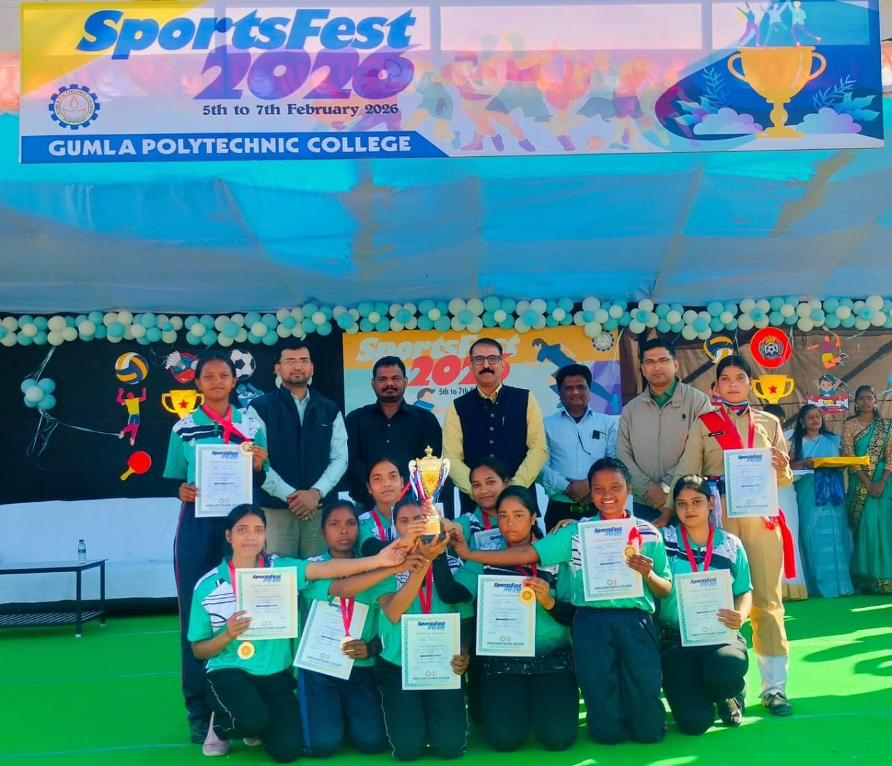 गुमला। 7 फरवरी 2026 को गुमला पॉलिटेक्निक कॉलेज में आयोजित वार्षिक तीन दिवसीय स्पोर्ट्सफेस्ट 2026 का समापन भव्य एवं उत्साहपूर्ण माहौल में हुआ। 5 फरवरी 2026 से प्रारंभ हुए इस खेल महोत्सव में छात्र-छात्राओं के लिए कई रोमांचक खेल प्रतियोगिताओं का आयोजन किया गया, जिसमें खेल भावना, टीम वर्क और उत्कृष्टता का शानदार प्रदर्शन देखने को मिला।